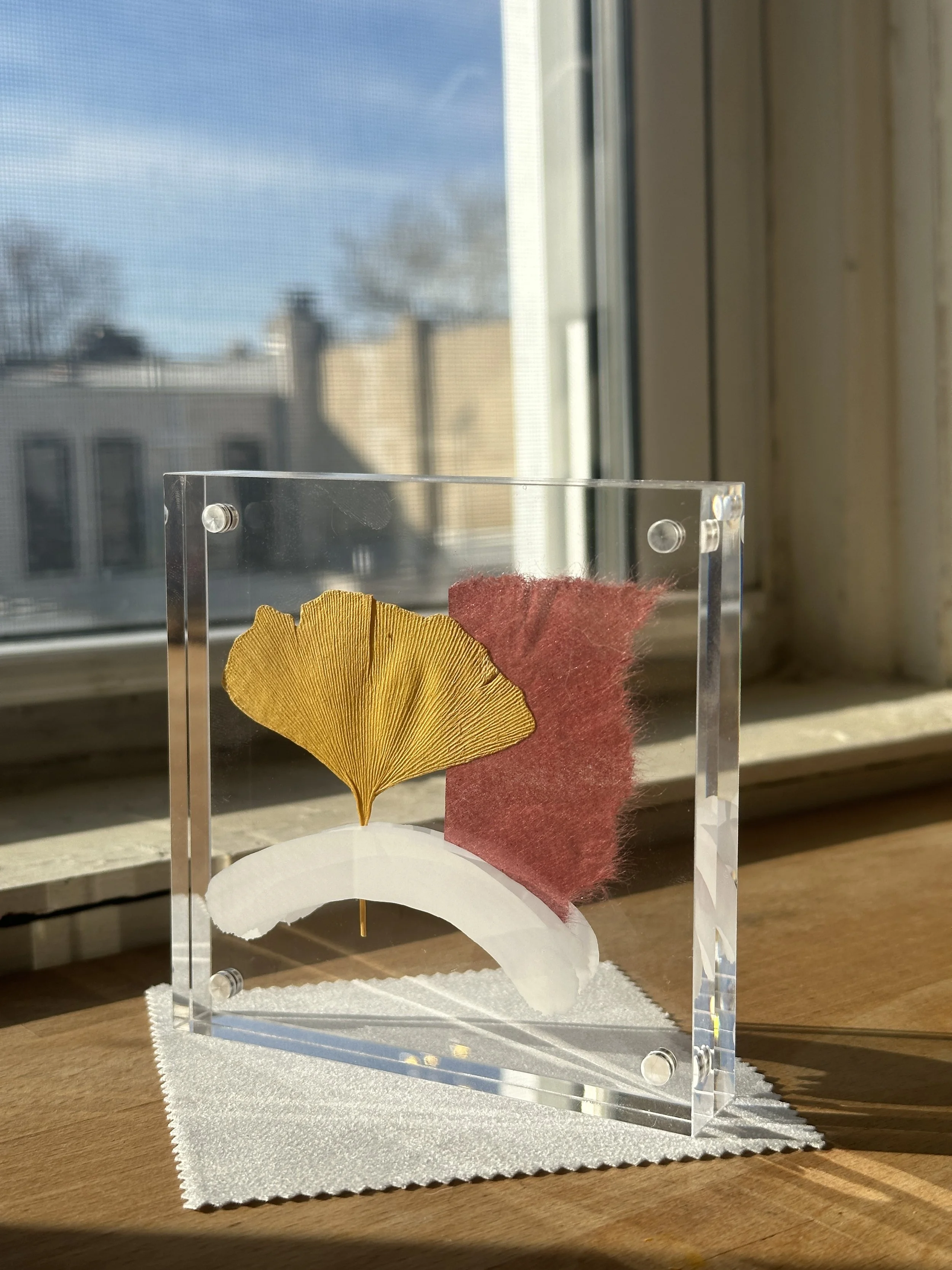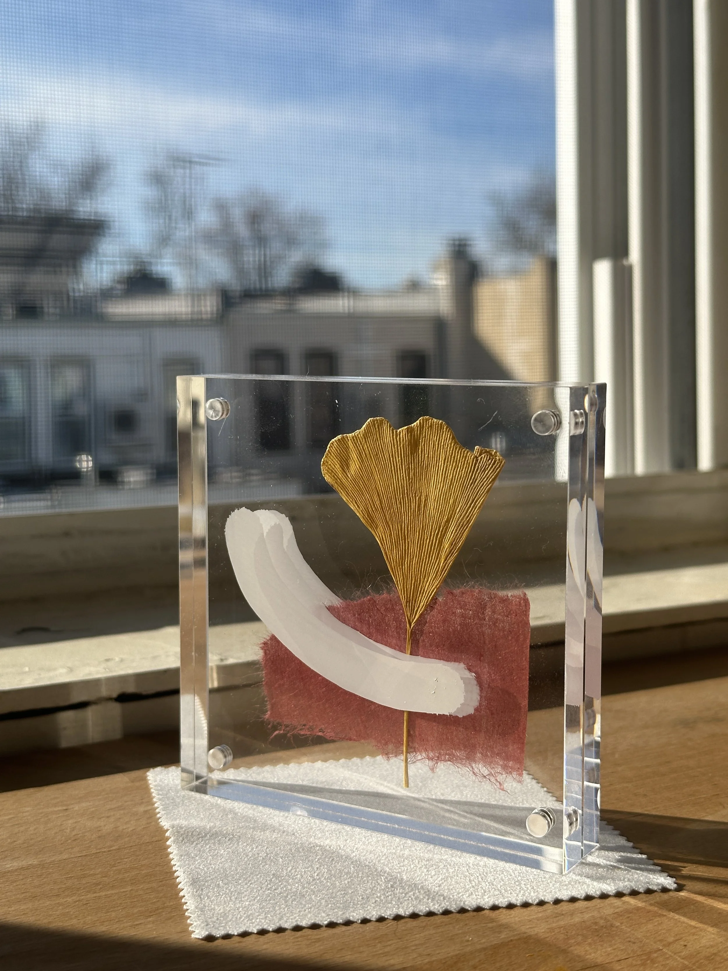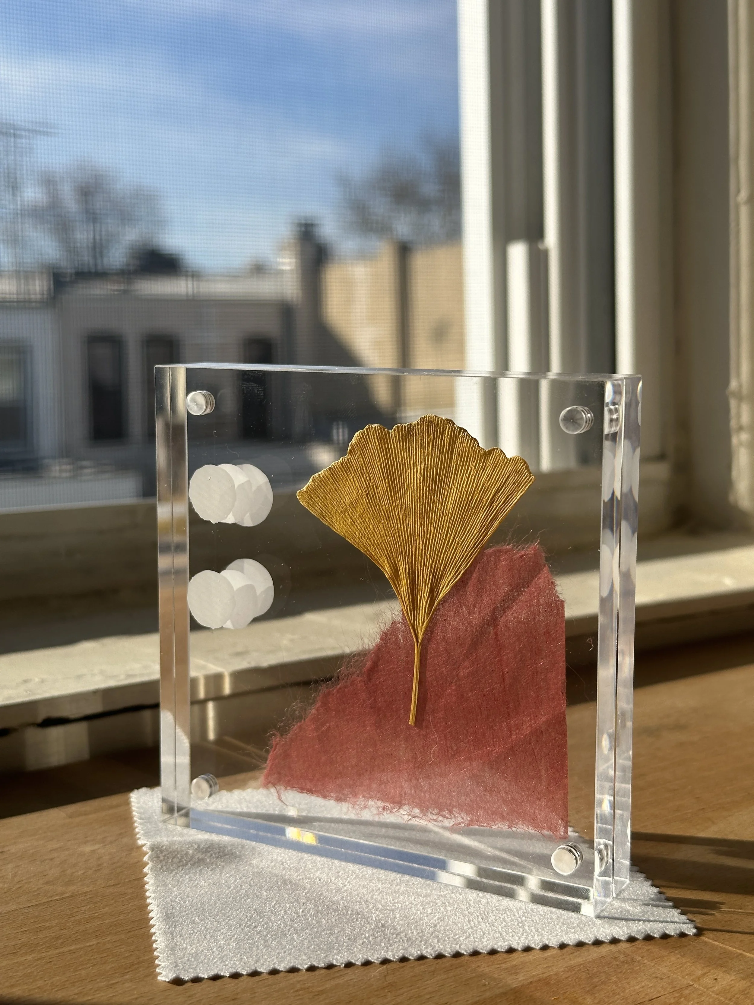 Ginkgo leaf compositions – Leaves collected in Prospect Park paired with washi paper and layered KRINK ink.