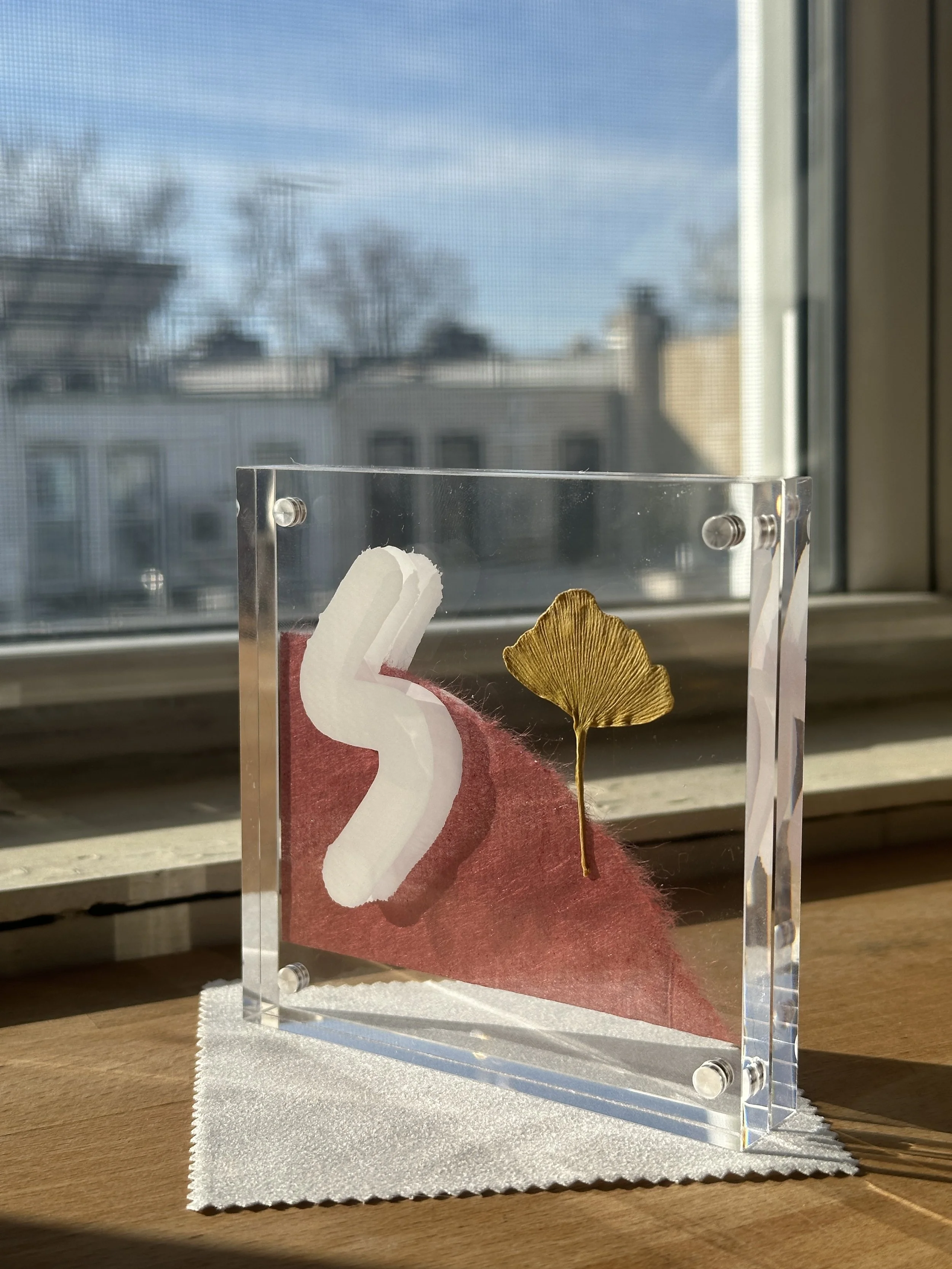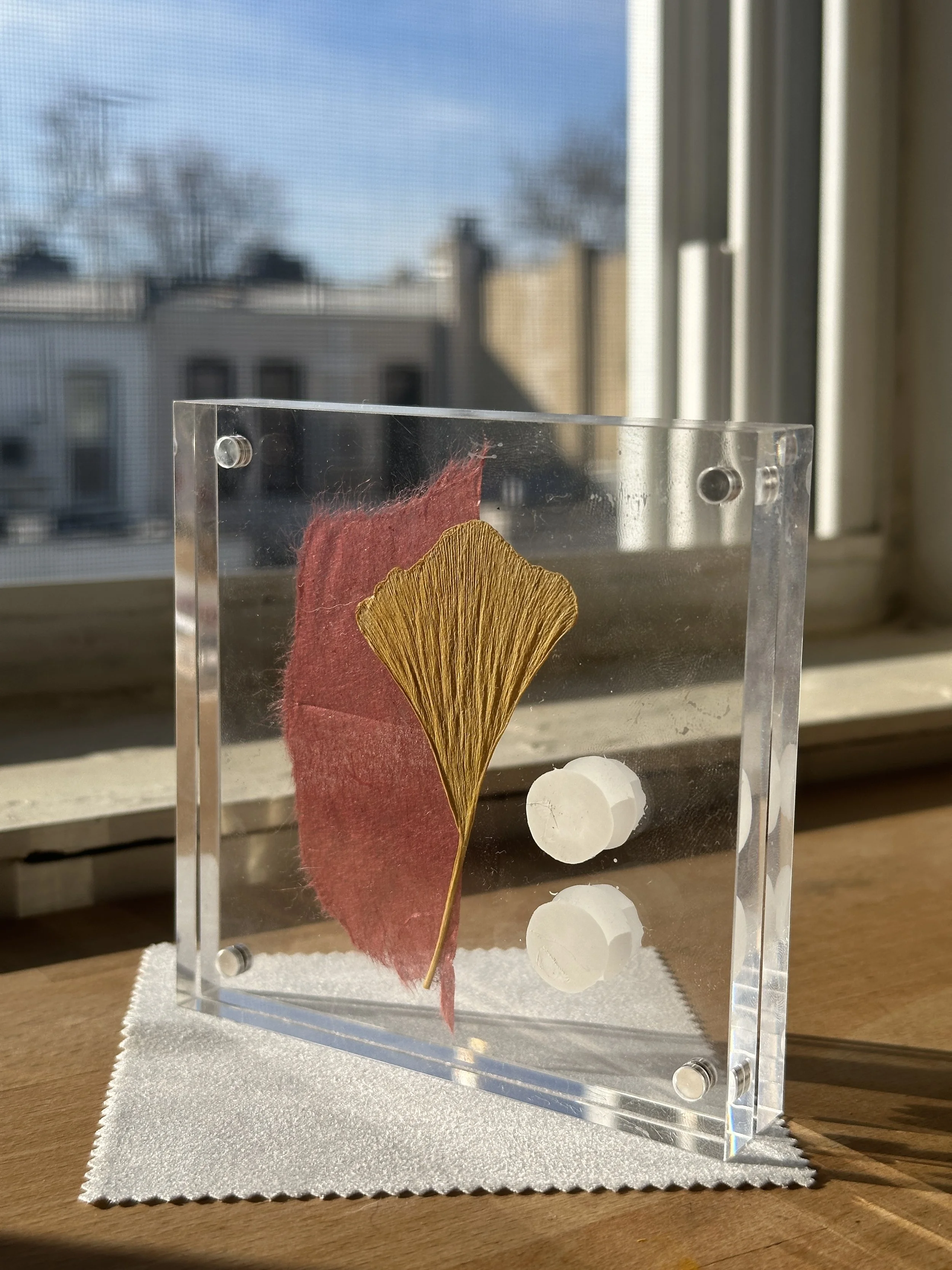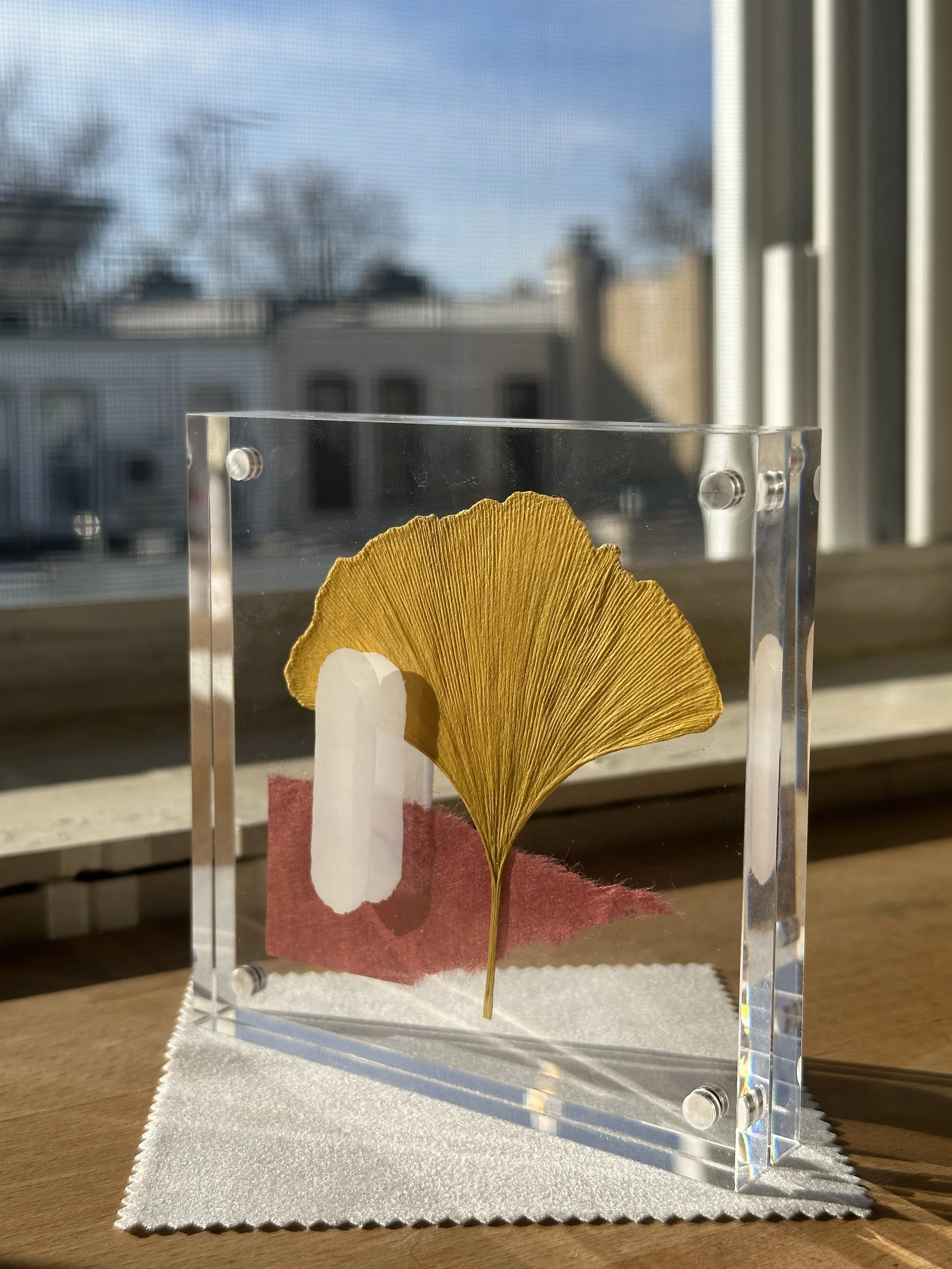Ginkgo leaf compositions – Leaves collected in Prospect Park paired with washi paper and layered KRINK ink.