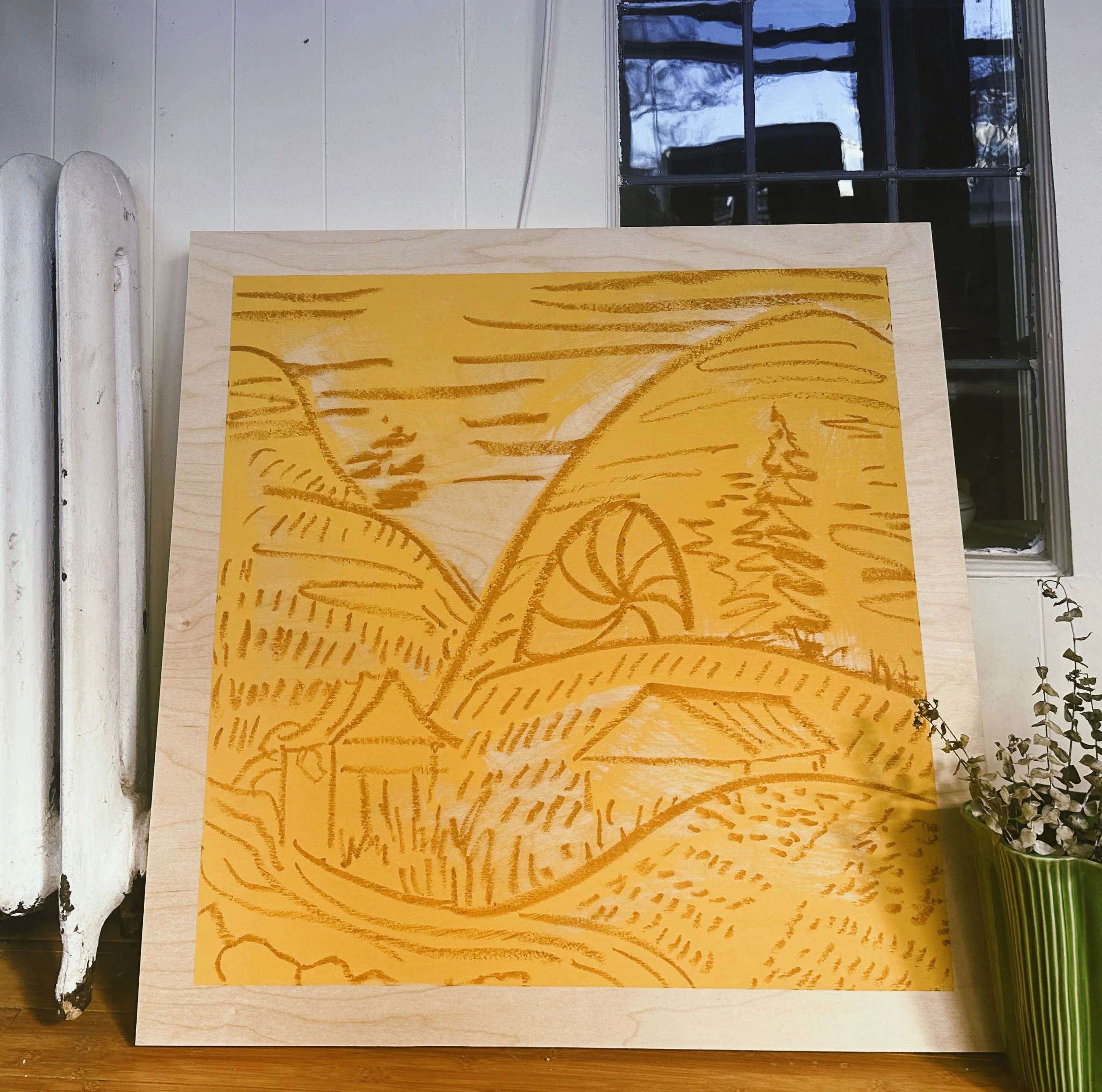 “House of Light”, acrylic paint, oil sticks, wood panel, 30x30", 2023.